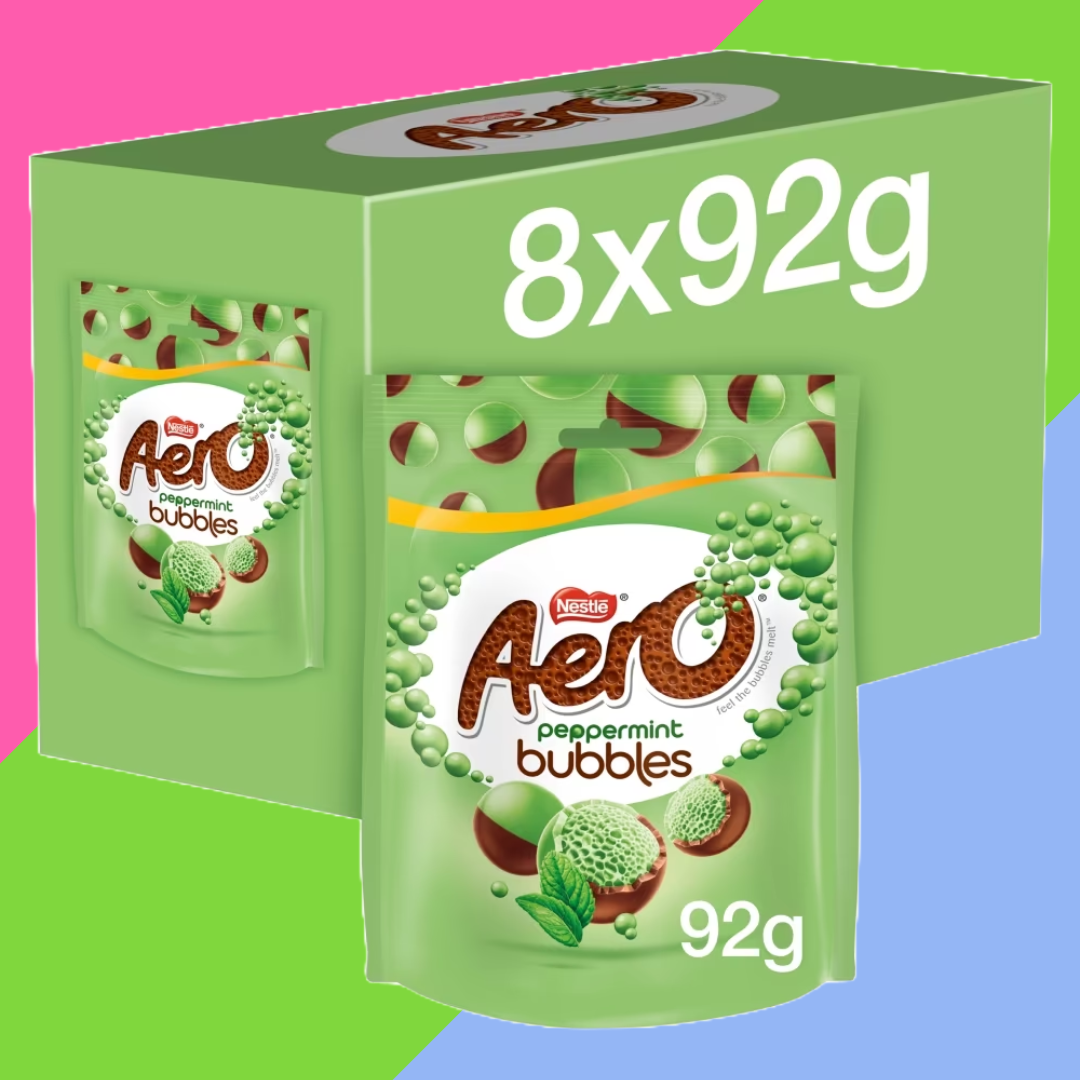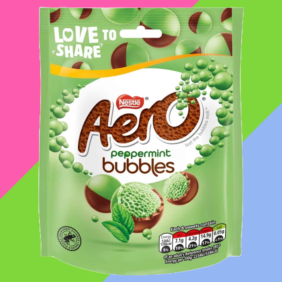 With a smooth milk chocolate shell and a light, bubbly peppermint centre, Aero® Peppermint Bubbles are perfect for moments between friends. When you fancy the lightness of bubbly mint chocolate, pick up a bag of Peppermint Aero® Bubbles to enjoy with friends and family. These delightfully bitesize bubbles of Aero peppermint-flavoured chocolate in smooth chocolate shells are perfect for sharing of bubbly pleasure, whether you're watching a film with your family or catching up with friends.