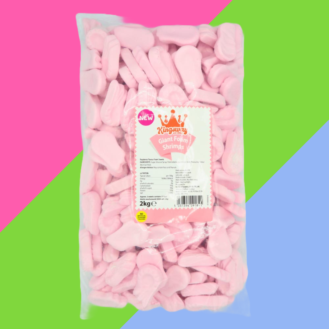 Foam Shrimps are a pick n mix classic, and these Kingsway Giant Foam Shrimps take them to the next level! Packed into a 2kg bulk bag, these super-sized, soft, and foamy shrimp-shaped sweets with a bold flavour that’s hard to resist. No pick n mix selection is complete without them! Add them to your pick and mix bins, scoop them into paper bags for that traditional sweet shop feel, or use them in sweet cones to create fun and unique gifts.