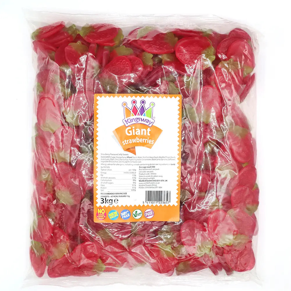 Our Kingsway Giant Strawberries are a beloved pick n mix sweet that is always in demand. These succulent, juicy jelly sweets are bursting with the irresistible flavour of freshly picked strawberries. Suitable for vegan and vegetarian customers, plus the fact that they have a recipe free from artificial colours or flavours, these popular pick and mix sweets will appeal to a broad range of shoppers.