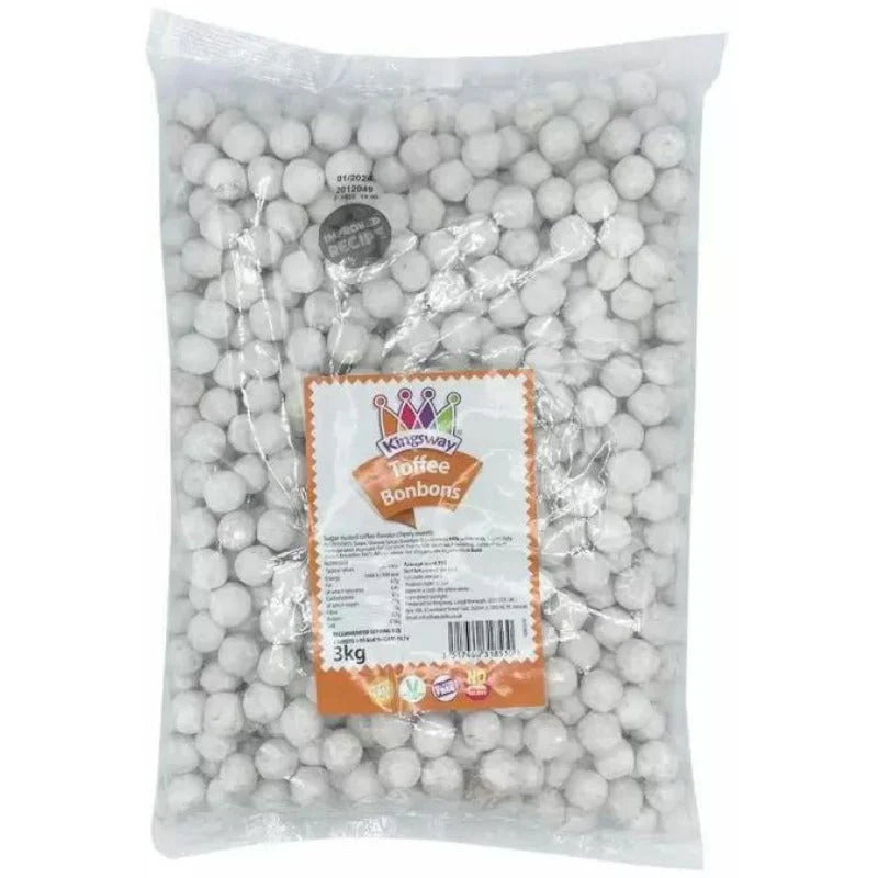 Bonbons are an all time favourite pick & mix treat, available in a wide range of flavours and colours bon bons are the perfect addition to any sweets display. The Kingsway Toffee Bon Bons are bursting with delicious toffee flavour. Packed in a 3kg bag these chewy treats can also be repackage into smaller bags, boxes or jars mixed with other colourful sweets.