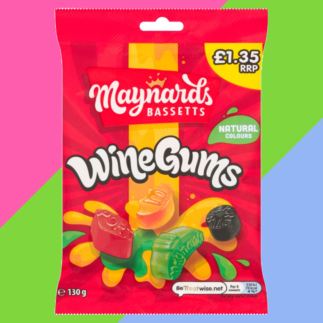 Maynards Bassetts Wine Gums are a timeless favourite. Delicious fruit-flavoured chewy gums made in a variety of dazzling colours, stamped with signature wine labels. Made with only natural colours, Wine Gums are lovingly created to give you the very best taste. This 130g is perfect for sharing with friends and family, and price-marked at £1.35, offering exceptional value to your customers.