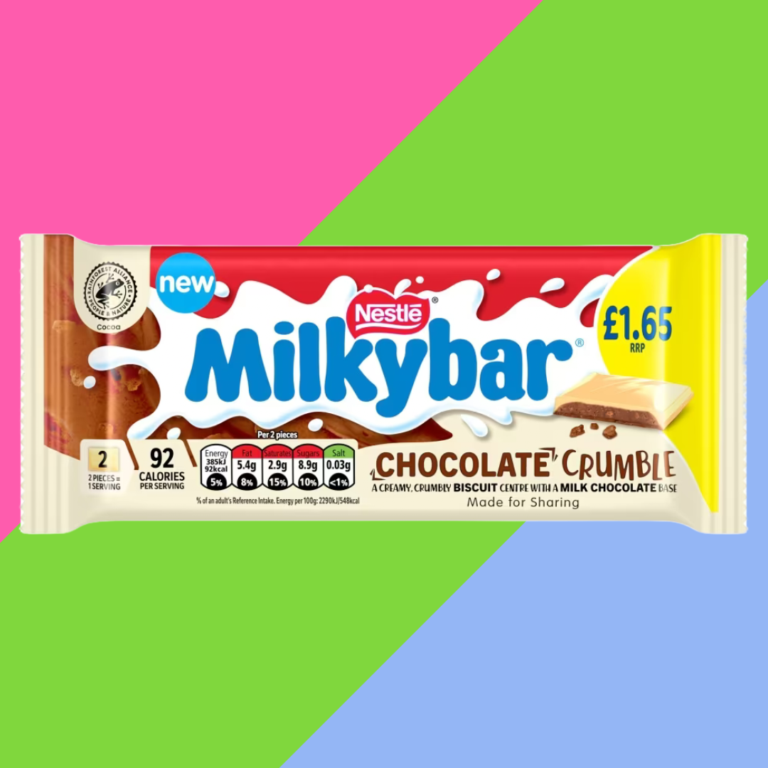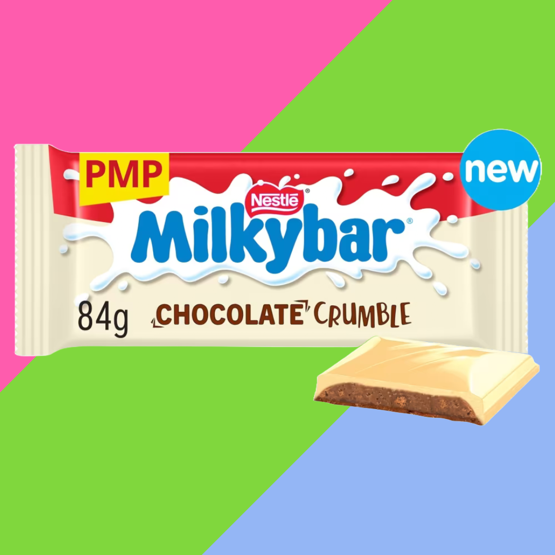 NEW Milkybar® Chocolate Crumble White Chocolate sharing bar 84g. A creamy, crumbly vanilla flavoured biscuit centre with a milk chocolate base, all covered in a white coating.