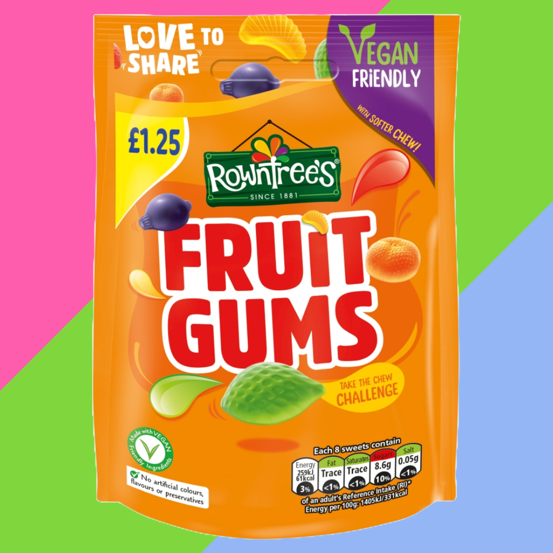 Rowntree’s® Fruit Gums are epically fruity-tasting gummy sweets in five delicious flavours. From blackcurrant to strawberry, lemon to lime and mouth-watering orange, everyone will find their favourite flavour with our sharing bag. And, these fruity, chewy sweets are now vegan friendly, for even more people to enjoy!