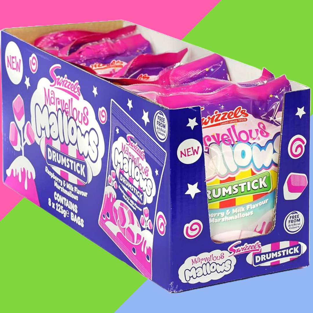 These Marvellous Mallows bring you magic in every mouthful. Leave your humdrum standard Marshmallow in the past and treat your taste buds with the latest enchanting creation from Swizzels. Immerse yourself in a flavour sensation as we've combined the texture of a soft, fluffy Mallow with the raspberry and milk flavour of a Drumstick Lolly. These Marvellous Mallows are packed into a 100g bag, which is great for sharing, and they're great value with their £1.25 price mark.